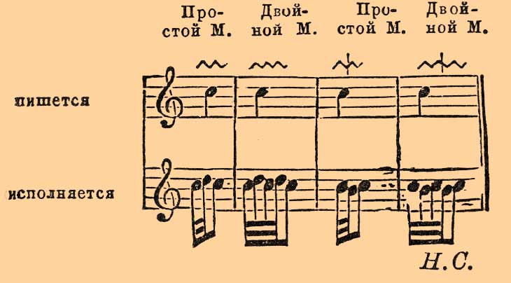 (двойной М.), поставленным над гармонической нотой. Простой М. состоит из