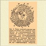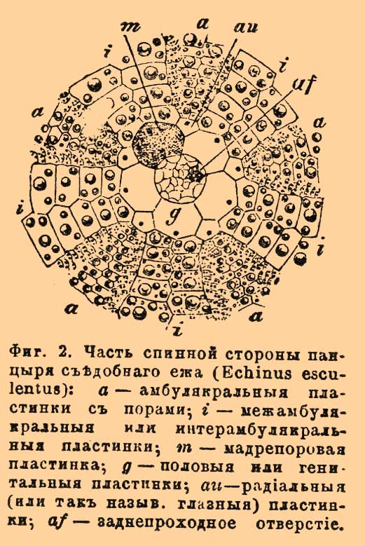 Фиг. 2. Часть спинной стороны панциря съедобного ежа (Echinus esculentus): a — амбулякральные пластинки с порами; i — межамбулякральные, или интерамбулякральные, пластинки; m — мадрепоровая пластинка; g — половые, или генитальные, пластинки; au — радиальные (или так назыв. глазные) пластинки; af — заднепроходное отверстие.