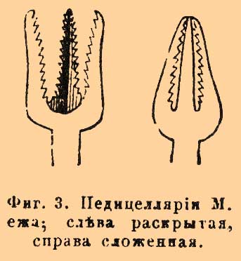 Фиг. 3. Педицеллярии М. ежа, слева раскрытая, справа сложенная.