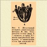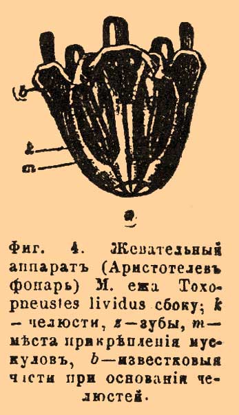 У неправильных ежей амбулякральные поля образуют особые расширения на верхнем полюсе, так наз. петалодии (см. фиг. 10 и 11 табл. Иглокожие). Рот у большинства М. ежей вооружен особым жевательным аппаратом ("Аристотелев фонарь", фиг. 4) из пяти сложных челюстей, оканчивающихся каждая плотным зубом и приводимых в движение особыми мускулами.