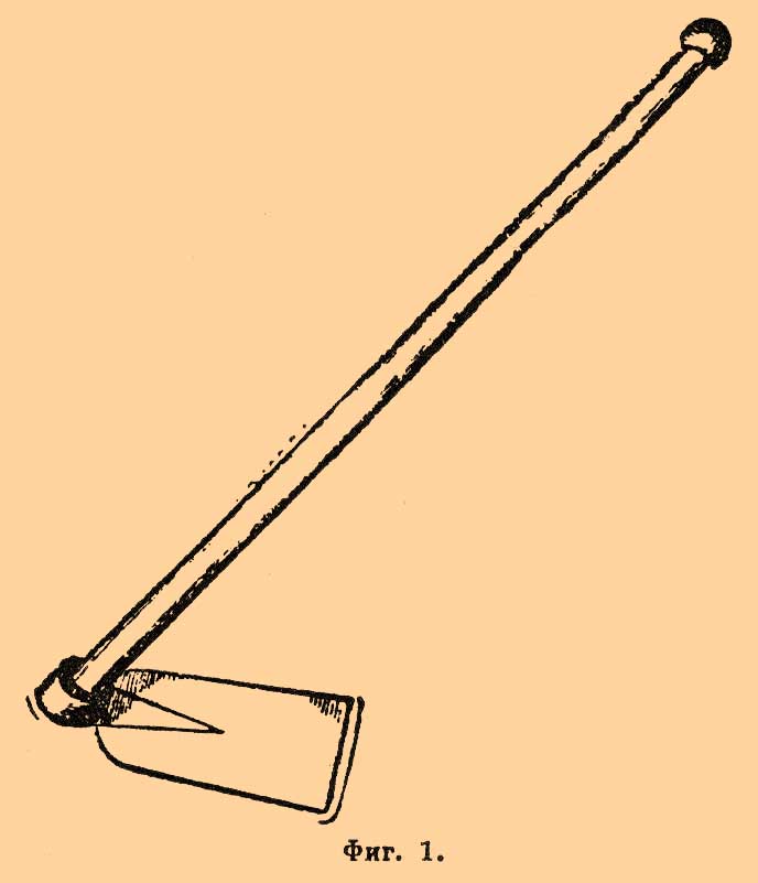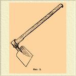 I) М. состоит из железного налопатника весьма различной формы, насажанного на длинную рукоятку, с которой он образует угол от 60° до 90°. При насадке налопатника под углом в 60° (фиг. 1), он, при ударе в землю, срежет лишь тонкий слой земли.
