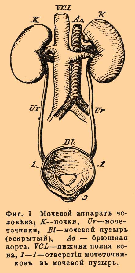 Мочеточники идут вниз, внутрь и вперед и открываются сзади в обширный общий резервуар — мочевой пузырь. Стенка последнего выстлана плоским эпителием и богата гладкими мышечными волокнами. Мочевой пузырь лежит позади лонного сращения, отчасти одет брюшиной (см. эту статью и фиг.), сзади прилегает у мужчин к прямой кишке, у женщин к матке. Верхушка его соединяется с пупком посредством тяжа Ligamentum vesico-umbilicale medium (заросший мочевой проток зародыша), боковые части посредством двух Ligamenta vesico-umbilicalia lateralia (заросшие пупочные артерии). Наружу моча выводится через мочеиспускательный канал, относительно длинный в мужских органах, где он проходит вдоль полового члена, окружаясь одним из его пещеристых тел, и короткий, широкий в женских органах, где он открывается в преддверие влагалища. На месте перехода мочевого пузыря в мочеиспускательный канал находится кольцевая мышца, замыкающая выход из пузыря — Sphincter vesicae. К верхнему концу почек прилегают два плоских желто-бурых органа, без выводных протоков — надпочечные железы, придаточные почки (Glandulae supraren a les, Nebennieren немецких авторов). По происхождению (см. выше) они стоят в связи с М. системой, кроме того, в построении их принимает участие и симпатическая нервная система. В них различают более плотный наружный, корковый слой и более мягкий внутренний. Они обильно снабжены кровеносными и лимфатическими сосудами; функция их совершенно неизвестна.