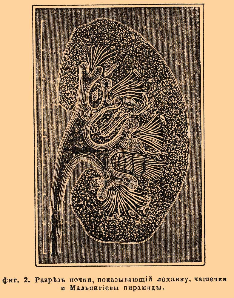 Фиг. 2. Разрез почки, показывающий лоханку, чашечки и Мальпигиевы пирамиды.