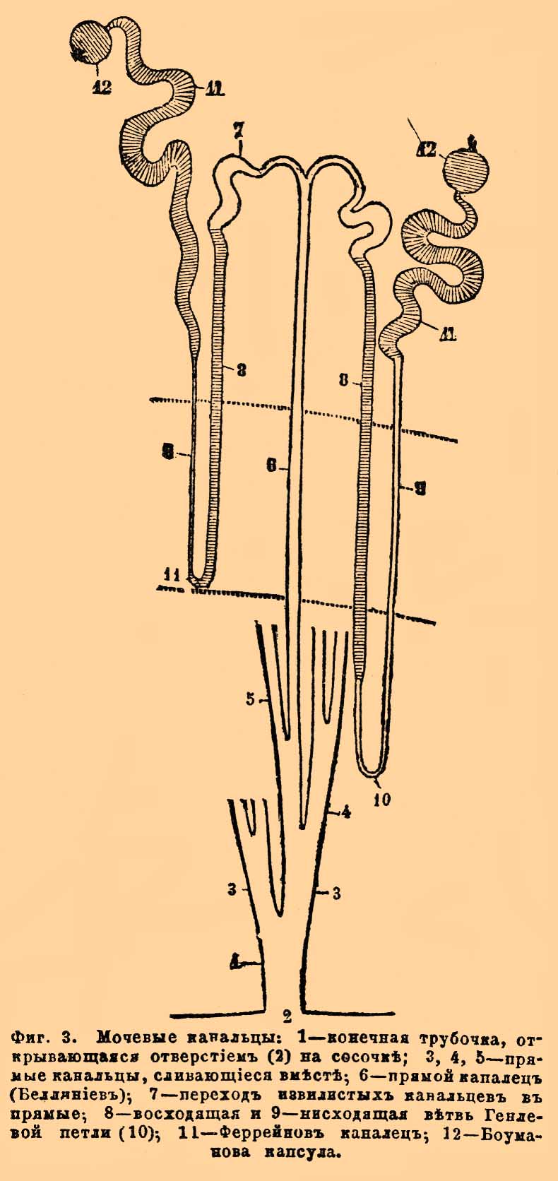 Фиг. 3. Мочевые канальцы: 1 — конечная трубочка, открывающаяся отверстием (2) на сосочке; 3, 4, 5 — прямые канальцы, сливающиеся вместе; 6 — прямой каналец (Беллиниев); 7 — переход извилистых канальцев в прямые; 8 — восходящая и 9 — нисходящая ветвь Генлевой петли (10); 11 — Феррейнов каналец; 12 — Боуманова капсула.