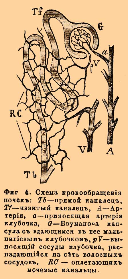 Фиг. 4. Схема кровообращения почек: Tb — прямой каналец, Tf — извитый каналец, А — артерия, а — приносящая артерия клубочка, G — Боуманова капсула со вдающимся в нее мальпигиевым клубочком, pV — выносящий сосуды клубочка, распадающийся на сеть волосных сосудов, RC — оплетающих мочевые канальцы.