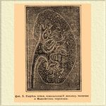 Почки представляют две больших бобовидных железы, лежащих в поясничной области брюшной полости, позади выстилающей ее брюшины (см.); положение их по отношению к другим брюшным внутренностям см. на табл. Брюшные внутренности (II). Правая почка лежит несколько ниже левой. Выпуклой стороной они обращены наружу, вогнутой, где в них входят и выходят из них кровеносные сосуды и где начинаются мочеточники (почечные ворота — Hylus) — к средней линии. Они окружены слоем рыхлой соединительной ткани со значительными отложениями жира (Capsula adiposa), удерживающим их в определенном положении. Однако, связь почек с лежащими под ними частями может становиться более слабой, сосуды, входящие в почки, могут удлиняться, и почки получают возможность более или менее значительных смещений (см. Блуждающая почка). Цвет почек красно-бурый, переходящий при приливах крови в более темный и синевато-красный. Поверхность почек гладкая и покрыта плотно прилегающей фиброзной оболочкой (Tunica propria s. Capsula fibrosa). На разрезе почки различается наружный корковый красно-бурый слой (substantia corticails s. vasculosa s. glomerulosa) и внутренний сероватый сердцевинный слой (Substantia medu llaris s. tubulosa), образующий обращенные верхушкой к почечным воротам Мальпигиевы пирамидки (Pyramides Malpighii), числом от 24 — 28 в каждой почке, дающие на разрезе треугольные сечения.