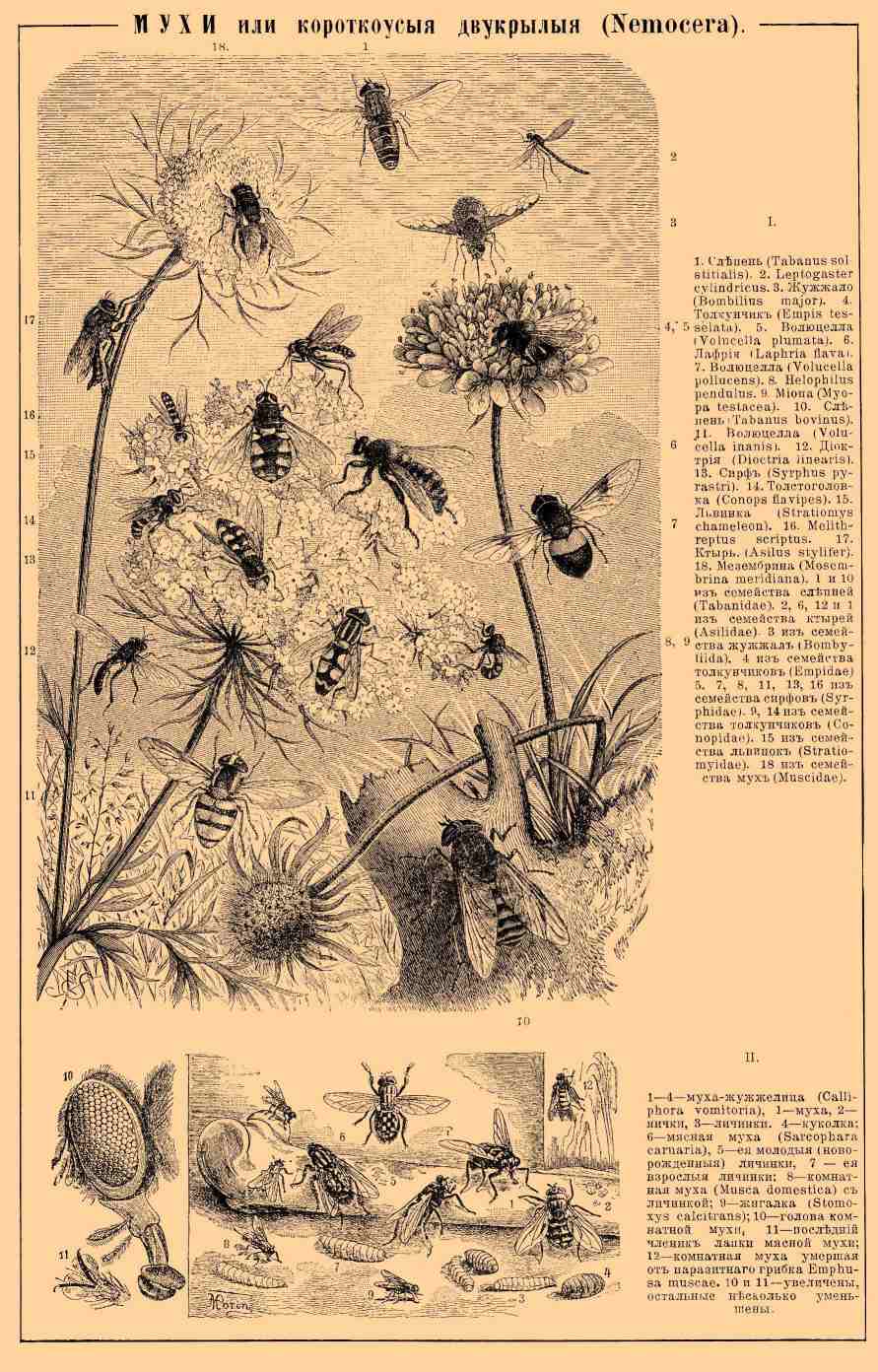 II. 1—4. муха-жужжелица (Calliphora vomitoria), 1 — муха, 2 — яички 3 — личинки. 4 — куколка: 6 — мясная муха (Sarcophara carnaria). 5 — ее молодые (новорожденные) личинки, 7 — ее взрослые личинки; 8 — комнатная муха (Musca domestica). с личинкой; 9 — жигалка (Stomoxys calcitrans); 10 — голова комнатной мухи, 11 — последний членик лапки мясной мух; 12 — комнатная муха, умершая от паразитного грибка Emphusa muscae. 10 и 11 — увеличены, остальные несколько уменьшены.