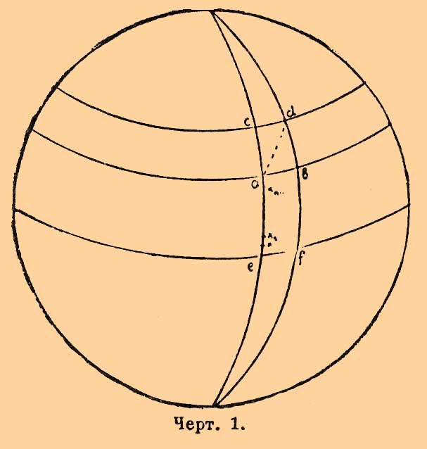 Пусть (черт. 6) А есть та точка, откуда корабль вышел, называемая отшедшим пунктом, φ 0 и λ 0 ее широта и долгота, предполагаемая известными; точка В есть та, куда корабль пришел, называемая пришедшим пунктом; зная AB = l миль и курс k, надо вычислить широту φ 1 и долготу λ 1 точки В. Так как корабль шел одним курсом, то путь его AB есть дуга локсодромии: разделив AB на весьма большое число n равных частей и проведя через точки деления с 1, с 2 ... с n — 1 параллели и меридианы, получим ряд весьма малых прямоугольных треугольников, у которых у всех гипотенуза равна AB/n = l/n, и угол между гипотенузой и элементом меридиана равен k. Разность широт Δφ 0 = φ 1 — φ 0 точек А и В есть дуга AD меридиана между параллелями этих точек.