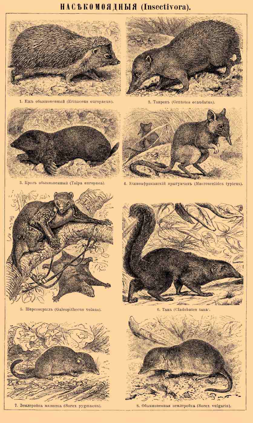 1. Еж обыкновенный (Erinaceus europaeus). 2. Танрек (Cantetes ecaudatus). 3. Крот обыкновенный (Talpa europaea). 4. Южно-африканский прыгунчик (Macroscelides typicus). 5. Шерстокрыл (Galeopithecus volans). 6. Тана (Cladobates tana). 7. Землеройка-малютка (Sorex pygmaeus). 8. Обыкновенная землеройка (S orex vulgaris).