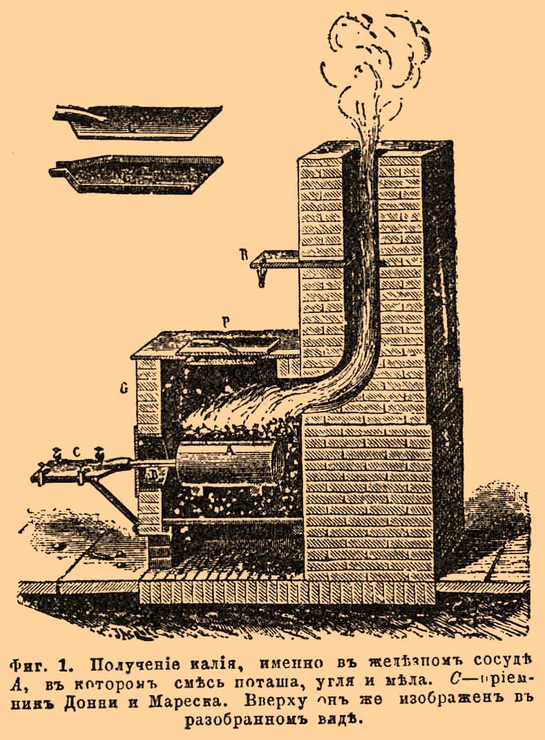 Фиг. 1. Получение калия, а именно в железном сосуде A, в котором смесь угля, поташа и мела. C — приемник Донни и Мареска. Вверху он же изображен в разобранном виде.