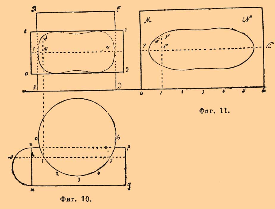 Пусть (фиг. 10) плоскость плана будет перпендикулярна к большой трубе, а плоскость фасада параллельна осям обеих труб. Тогда план большой трубы будет окружность 036 и фасад ее изобразится прямоугольником ABCD. План малой трубы будет mnpq и фасад abcd. Пусть HF будет фасад диаметральной и параллельной плану плоскости малой трубы. На nm, как на диаметре, опишем дугу nsm. Зададимся какой-нибудь образующей h5 малой трубы и определим фасад той точки взаимного пересечения труб, которая лежит на этой образующей и план которой есть, следовательно, точка 1. Искомый фасад точки, во-первых, должен лежать на перпендикуляре, опущенном на общий прорез из точки 1. Во-вторых, он будет лежать от HF на высоте HS, равной hs. Итак, точка S есть искомый фасад. Задаваясь другими образующими и строя фасады точек взаимного пересечения труб, получают целый ряд точек, соединением которых получится фасад пересечения труб. Теперь развернем полуокружность 036. Задача эта (см. Квадратура) может быть исполнена только приближенно. Она решается с достаточным приближением, если принять длину полуокружности за сумму стороны вписанного квадрата и стороны правильного вписанного треугольника. Сторона вписанного квадрата будет хорда 36, сторона треугольника есть хорда 04, если цифры обозначают деления полуокружности на 6 частей. Сумму этих хорд откладывают на особом чертеже (фиг. 11) и делят ее на 6 частей. Пусть PQ будет соответствовать упомянутой диаметральной плоскости малой трубы: она должна быть проведена параллельно прямой 012... на расстоянии OP=AE. Восставляя из деления 1 перпендикуляр к прямой 012... и откладывая на нем от пересечения его с PQ величину h's'=hs=HS, получим точку s' той искомой кривой, по которой должно быть вырезано в листе MN окошко. Получая таким же путем другие точки искомой кривой, определим и самую эту кривую, изображенную на чертеже (фиг. 11).