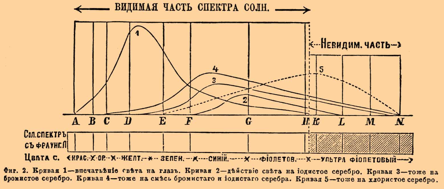 А) Действием света производится в частицах чувствительного слоя химическое разложение. Но не все световые лучи производят сказанное действие с одинаковой силой; некоторые действуют сильнее и производят разложение в большой массе серебряной соли, другие слабее с разложением лишь малых ее количеств. Говоря об этом различном действии световых лучей, следует строго различать самую силу световых лучей от их окраски или цвета. Действительно, с одной стороны, предметы могут быть одного цвета, но с различной степенью освещения, а с другой — они могут быть равносильно освещены, но иметь различную окраску. По отношению к силе света его разлагающее действие пропорционально времени и силе освещения, но совершенно другую зависимость приходится наблюдать в отношении чувствительного слоя к лучам различной окраски. В этом последнем случае надо иметь в виду две стороны дела, с одной: а) окружающие нас предметы с их различной окраской передаются на фотографическом снимке в виде одноцветного рисунка; следовательно, уже по одному этому является некоторая условность этого рисунка. Для примера возьмем цветной ковер, узор которого состоит из фигур и фона различных цветов, но одинаковой яркости. Что должна передать нам на своем снимке идеальная фотография (разумея обычную, а не цветную фотографию)? — Она должна дать нам однотонную поверхность, не передав узора, так как и рисунок, и фон ковра передадутся на фотографии одним и тем же цветом и с одинаковой яркостью, между тем как для глаза ковер кажется не гладким, а узорчатым. Так должен бы передаться рисунок вышеописанного ковра при идеальной фотографии, к которой приближается фотография ортохроматическая, но при обычных способах фотографирования эта условность идет еще далее, причем, с другой стороны: б) лучи света одинаковой силы, но различно окрашенные действуют на чувствительные соли серебра и приготовленный из них чувствительный слой совершенно своеобразно и притом вполне отлично от того действия, которое имеют они на ретину глаза. Яснее всего указанное различие в действии лучей различной окраски выясняется при фотографировании солнечного спектра. Удобство рассмотрения подобных вопросов на фотографировании спектра основывается на том, что в спектре имеются все основные цвета (и притом в их чистейшем виде), из сочетания которых слагаются все остальные цвета окружающих нас предметов; кроме того, цвета в спектре располагаются по порядку длины их световых волн, что дает возможность точно сравнивать результаты различных наблюдений, в особенности пользуясь всегда однообразным расположением в поле спектра темных Фрауенгоферовых линий. На фиг. 2 в верхней ее части, где мы приводим несколько кривых, по горизонтальной оси откладываются расстояния между Фрауенгоферовыми линиями спектра, подобно тому как они представляются нам в спектроскопе, а по вертикальной оси откладываются части, пропорциональные относительной силе действия лучей — в кривой № 1 на ретину глаза, а в остальных на различные соли серебра.