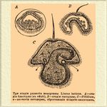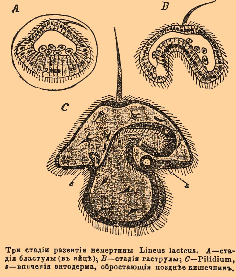 Три стадии развития немертины Lineus lacteus. A — стадия бластулы (в яйце); B — стадия гаструлы; C — Pilidium, s — впячения энтодерма, обрастающие позднее кишечник.