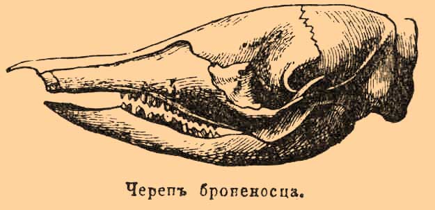 Лишь у некоторых броненосцев шов между межчелюстными и верхнечелюстными костями проходит позади первого зуба, у остальных все зубы сидят в челюстных костях.
