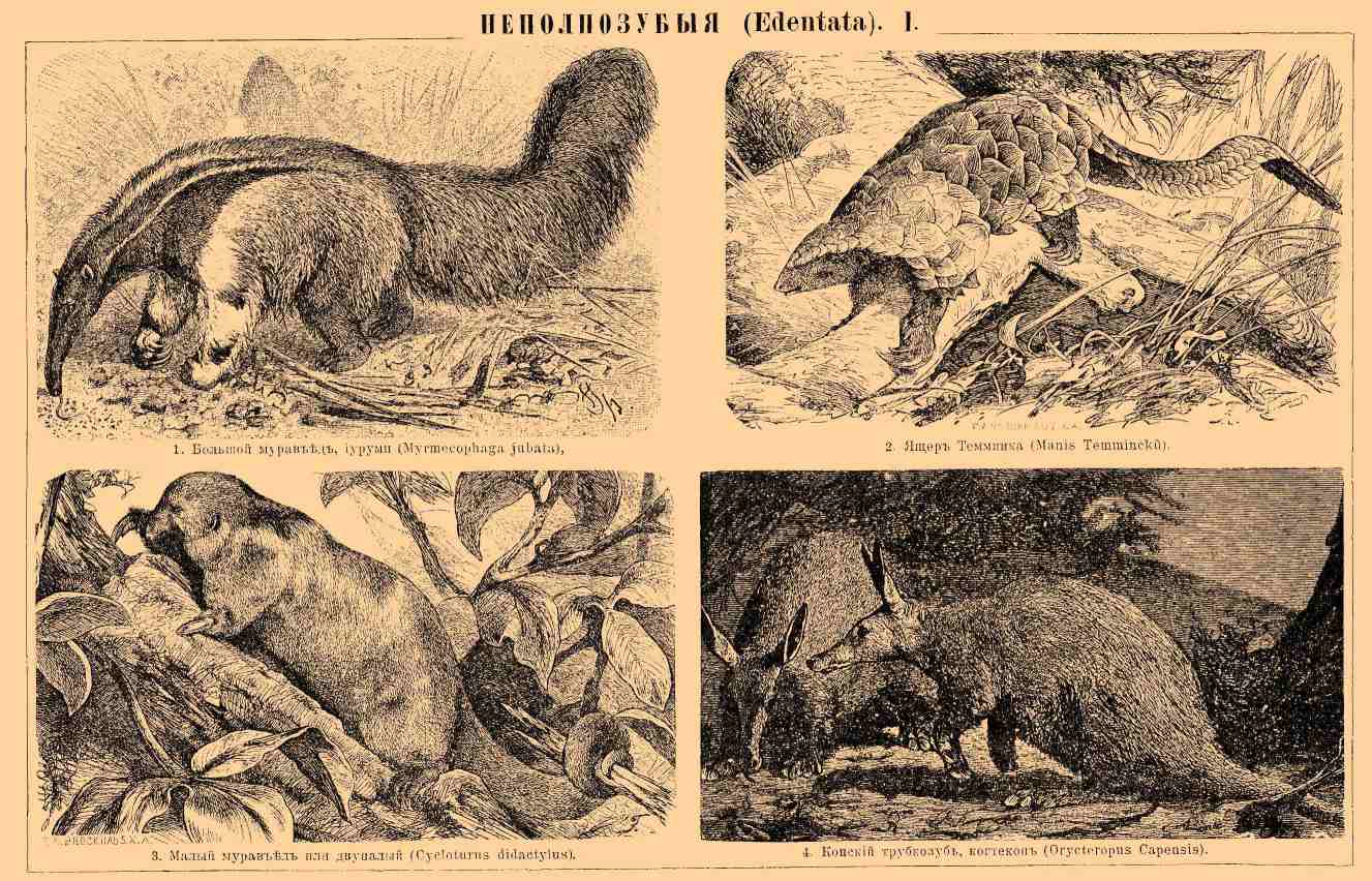 1. Большой муравьед-иуруми (Myrmecophaga jubata). 2. Ящер Темминка (Manis Timmenk û). 3. Малый муравьед или двупалый (Cycloturus didactylus). 4. Конский трубкозуб-когтекоп (Orycteropus Capensis).
