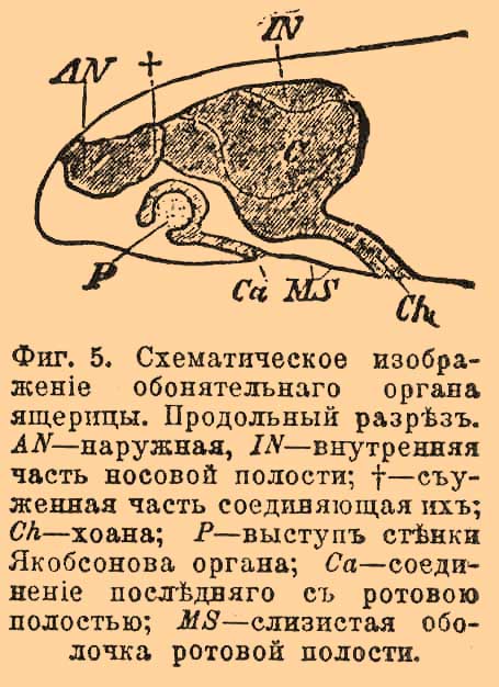 Фиг. 5. Схематическое изображение обонятельного органа ящерицы. Продольный разрез. AN— наружная, IN -внутренняя часть носовой полости; + — суженная часть соединяющая их; Ch— хоана; Р-выступ стенки Якобсонова органа; Са—соединение последнего с ротовой полостью; MS— слизистая оболочка ротовой полости.