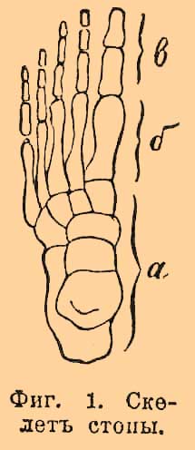 — О. должна не только защищать ногу от холода, пыли и мокроты, но и делать для неё нечувствительными неровности, в то же время ничем не стесняя свободу движений, кожную испарину и т. д. и не изменяя естественной формы стопы и пальцев. Как внешняя форма О., так и качество материала, из которого она изготовляется, в значительной степени зависят от культурного развития народа, от местных обычаев, от климатических условий страны и от специального значения ее в том или другом случае. Этим и объясняется, что многие виды обуви имеют лишь ограниченное распространение, хотя хорошо приспособлены к известным внешним обстоятельствам (валяные сапоги северян, лапти русских крестьян, опанки южных славян, деревянные сандалии альпийских горцев и т. п.). Повсеместным распространением в цивилизованном мире пользуются только башмаки и сапоги, — а между тем именно эта форма О., больше других подвергаясь влиянию моды, сплошь и рядом не удовлетворяет вышеназванным требованиям и часто навлекает на себя справедливые нарекания с точки зрения гигиены. Особенное значение хорошая О. имеет для войска и главным образом для пехоты. Выдающиеся военачальники во все времена обращали специальное внимание на солдатскую О. (Юлий Цезарь, маршал Саксонский, герцог Веллингтон, генералы Радецкий, Скобелев, Драгомиров и др.). Поводом к этому служат частые заболевания ног у солдат, ведущие к массовому выбыванию их из строя, и притом в самое критическое для армии время — в начале походов и т. п. По исследованию Брандта фон Линдау, из 600000-ной германской армии (пехоты), в первые же дни после мобилизации, становятся негодными к исполнению своих обязанностей, из-за болезненного состояния ног, не менее 30000 человек; из-за этих же страданий, в Германской империи, из рекрутов 1876-79 гг. было отпущено 50763 человек, т. е. 31‰ всех лиц, подвергшихся медицинскому осмотру, и до 143‰ всех объявленных не годными к военной службе. Подобные же указания о состоянии ног у рекрутов дают и австро-венгерские статистические летописи: в 1870 г. из 277972 забракованных рекрутов 41817 имели испорченные и искалеченные ноги, в 1876 г. из 414732 забракованных было отпущено из-за ног не менее 53221 человек; вообще негодными, благодаря ножным страданиям, в Австро-Венгрии можно считать 100‰ всех лиц, подвергающихся медицинскому осмотру при приеме в войска. Больных ногами в германских войсках около 15%; в одной прусской армии за один год бывает больных ножными язвами почти 6500 человек, причем эти язвы происходят главным образом от давления О. — узких сапог и проч. Во французской армии из 100 пехотинцев в течение первых дней похода 25-30 человек заболевают ногами. Войска Североамериканских Штатов, при начале междоусобной войны, в первые 14 дней лишились половины своего состава из-за тесной О., отчего даже, временно был прекращен поход. О заболеваниях ног в русской армии, приобретаемых вследствие неудобной О., не имеется никаких положительных данных, но не подлежит сомнению, что и русский солдат страдает от "казенного" сапога. В одном из приказов генерала Скобелева говорится: "первое, что при невнимании становится негодным в походе это — сапоги, и тогда здоровый, крепкий, храбрый солдат становится также негодным". Человеческая стопа состоит из 26 костей (см. фиг. 1), которые по форме могут быть разделены на две различные группы: а) задний отдел сто