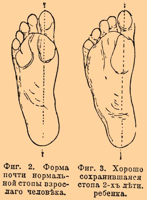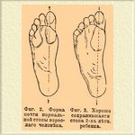 Взаимное расположение всех этих костей обусловливает внешнюю форму стопы. Нормальную, здоровую ногу, скорее всего можно найти у маленьких детей, еще не носивших О., или же у взрослых, никогда не носивших тесной О. и привыкших или ходить босиком, или носить О. мягкую, не производящую никакого насилия над стопой. Такая нога отличается главным образом следующими свойствами: