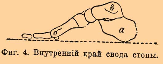 2) Стопа должна быть в состоянии выдерживать и правильно распределять тяжесть тела, что достигается особым расположением костей двух задних отделов стопы (пяточных и плюсневых), имеющих, в архитектурном отношении, форму полукупола или, точнее, полуовоида. Если смотреть на стопу с внутреннего ее края, то можно заметить, что линия ее продольного разреза образует свод, упирающийся о почву двумя точками (см. фиг. 4), — задним бугром пяточной кости (а) и головкой плюсневой кости большого пальца (б).