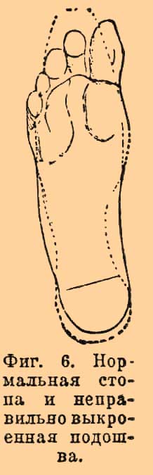 При таких условиях человек вынужден ходить как на ходулях; о нормальном развертывании ноги при ходьбе не может быть речи, а вся стопа поднимается разом; кроме того, тяжесть тела распределяется на значительно меньшую площадь, чем при нормальной стопе, а вследствие этого походка лишается твердости и эластичности. Но и обычная европейская О. (башмаки, полусапожки, сапоги) сильно грешит против нормальной формы стопы, и притом преимущественно, и прежде всего, неправильной выкройкой подошвы, представляющей фундамент башмака или сапога. Обыкновенно подошва выкраивается симметрично по обеим сторонам средней линии, так что один и тот же башмак может служить как для правой, так и для левой ноги (так изготовляются обыкновенно башмаки для женщин и детей); но даже в таком случае, когда подошва выкраивается "по ноге", асимметричность ее является, в сущности, кажущейся, так как на самом деле и передняя часть подошвы и пятка скроены симметрично к средней оси и вся асимметричность подошвы заключается в том, весьма второстепенном обстоятельстве, что мостик, соединяющий обе названные части, образует небольшой угол кнаружи. При таком способе выкраивания подошвы внутренний край сапога получает закругление, тогда как внутренний край нормальной стопы представляется прямолинейным, соответственно "Мейеровской" линии. Прилагаемая фигура (фиг. 6) — представляет отношение между нормальной стопой и неправильно выкроенной подошвой; последняя обозначена пунктиром.