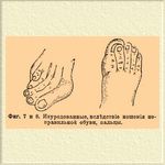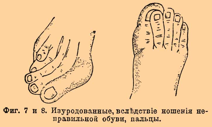 Подобная О. влияет гибельно на весь остов стопы. Конечно, нога, как мягкая часть, в особенности в детском возрасте, мало-помалу уступает давлению и принимает более или менее форму О., но при этом страдают не только мягкие части, но и скелет стопы. Прежде всего и сильнее всего поражаются пальцы, которые надвигаются друг на друга: большой палец, вместо прямого, принимает косое направление, с обращением его верхушки кнаружи, тогда как плюснево-фаланговый сустав его выгибается кнутри, нередко сильно утолщается и получает вообще безобразную форму, причиняющую много хлопот как "хозяину", так и сапожнику; другие пальцы искривляются разнообразно, смотря по форме сапога: весьма часто маленький палец представляется совершенно изуродованным, приплюснутым и прижатым к четвертому пальцу или надвинутым на него. Вообще форма пальцев настолько изменяется, что вся совокупность их, образующая на неиспорченной ноге неправильный четырехугольник (ограничиваемый с двух сторон наружным и внутренним краями пальцев, с третьей стороны — дугообразной линией, соединяющей свободные концы пальцев, а с четвертой — линией, проходящей через основания первых фаланг), представляет на изуродованной обувью ноге треугольник, вершину которого образует смещенная кнаружи верхушка большого пальца. Чем уже носок сапога, тем значительнее перемещение последних. Фиг. 7 и 8 показывают ноги, на которых пальцы, не имея достаточно простора в О., вытеснены из своего нормального положения кверху, книзу и в сторону, перекрещиваясь самым разнообразным образом.