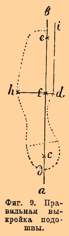 Чтобы сохранить, по возможности, естественную форму ноги и не нарушить ее функций, О. должна быть по форме и отдельным очертаниям подобна правильно сформированной стопе и, кроме того, должна быть приготовлена из мягкой и гибкой кожи. Подметка такой О. выкраивается так, чтобы большой палец мог занимать на ней свое стреловидное положение и не уклонялся бы верхушкой кнаружи. Ширина подметки равняется самому широкому поперечнику передней части ноги во время ступания, а длина ее, вследствие увеличения размеров стопы во время хождения, должна быть несколько больше расстояния от пятки до конца большого пальца. Форма и контуры ее должны соответствовать контурам неиспорченной правой и левой ноги (каждой в отдельности), причем две подметки, положенные рядом, друг около друга, соприкасаются своими внутренними краями везде, за исключением места, соответствующего изгибу свода стопы. Для выкраивания такой подошвы надо помнить, что центр пятки и продольная ось большого пальца лежат на одной прямой линии, которая, таким образом, является основой для начертания подошвы. Длину стопы, от заднего края пятки до верхушки большого пальца, наносят на прямую линию (аb, фиг. 9); затем на заднем конце этой линии отмечают центр пятки (c), нанося на ней половину длины последней (cd); таким же образом на переднем конце этой линии отмечают длину большого пальца (ef), считая от верхушки его до заднего края мякиша, т. е. до плюснево-фалангового сочленения, чем определяется место наибольшей ширины стопы; на этом месте (в пункте f) проводят линию (hd), перпендикулярную к длинной оси сапога и пересекающую ее под прямым углом; затем на эту вторую линию наносят размер самой широкой части стопы и притом так, чтобы на внутреннюю от неё сторону приходился лишь небольшой обрезок (fd), соответствующий половине ширины мякиша большого пальца, остальная же часть ширины стопы (fh) находилась бы кнаружи от продольной линии; наконец, для того, чтобы сапог вышел не слишком коротким, несколько удлиняют продольную ось его (на толщину большого пальца), и затем параллельно последней, начиная с внутреннего конца поперечной линии (т. е. с точки d), проводят новую линию, обозначающую внутренний край передней части подошвы (di).