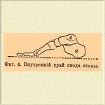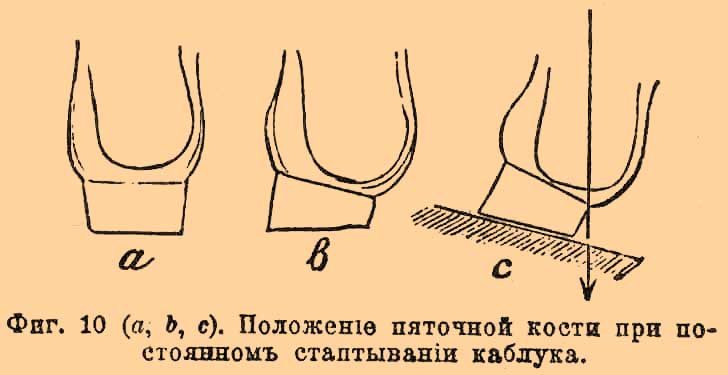 Каблуки необходимы для того, чтобы придать пятке должную опору и упругость; но их следует делать широкими и низкими — не выше 15-20 мм., и они должны подпирать одну пятку. Особенное внимание заслуживает так называемое "стаптывание каблуков", происходящее главным образом тогда, когда, под влиянием неправильного распределения тяжести тела по стопе, свод последней несколько "опрокидывается", с наклонением вершины его кнутри (начало образования плоской ноги). Именно при этих условиях пятка давит на наружную стенку задника и расширяет ее, а вследствие этого сильнее отягощается наружный край каблука и мало-помалу стаптывается (фиг. 10 a, b, c), что, со своей стороны, дает повод к частому и весьма опасному "подвертыванию" ноги, а равно и благоприятствует дальнейшему развитию плоской ноги.