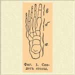 1) Общее расположение костей должно быть веерообразное, т. е. нога, начиная от пятки и кончая верхушками пальцев, должна постепенно расширяться; оси пальцев должны служить продолжением их плюсневых костей, и пальцы, вследствие этого, должны иметь стреловидное направление. Особенное значение это имеет для большого пальца, положение которого играет важную роль при ходьбе: при обыкновенной ходьбе поднятие стопы с почвы совершается не разом; прежде всего приподнимается пятка; затем постепенно, по направлению сзади кпереди, поднимаются и остальные части стопы, причем последняя, перед окончательным снятием её с почвы, упирается еще некоторое время на большой палец, вершина которого приподнимается последней. Но "развертываться" правильно стопа может только в таком случае если продольная ось большого пальца, будучи продолжена кзади, проходит через середину пятки (так называемая Мейеровская линия), т. е. если действительно большой палец, по отношению к внутреннему краю стопы, имеет стреловидное направление. Мейеровская линия представлена на прилагаемой фиг. 2, изображающей стопу почти нормальной ноги, а также и на фиг. 3, снятой с хорошо сохранившейся стопы двухлетнего ребенка.