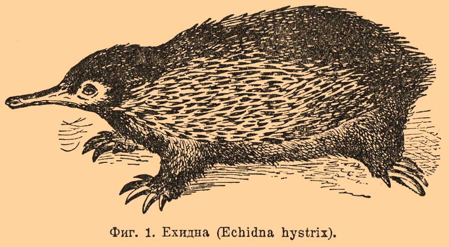 В ископаемом состоянии известны остатки представителей последнего семейства. Как в анатомическом, так и в эмбриологическом отношении О. резко отличаются от всех остальных млекопитающих и занимают в этом классе совершенно изолированное положение. Во многих отношениях они являются соединительным звеном между млекопитающими и низшими позвоночными (именно с Sauropsida, т. е. птицами и пресмыкающимися и с земноводными; но, несмотря на данное им название птицезверей, нельзя сказать, чтобы О. соединяли остальных млекопитающих именно с птицами). Наиболее характерные отличительные признаки О. следующие: это — яйцеродящие млекопитающие с млечными железами трубчатого типа, с клоакой, обособленными коракоидальными костями, с сумчатыми костями, без настоящих зубов, по крайней мере во взрослом состоянии. Тело одето мягкой густой шерстью из подшерстка и ости (у утконоса) или волосами и иглами (y Echidnidae). Конечности с развитыми пальцами, которые все или большая часть снабжены когтями. Челюсти удлинены, покрыты роговым футляром и образуют нечто похожее на клюв; у утконоса клюв похож на утиный, у Echidnidae он имеет вид трубочки прямой (у ехидны) или согнутой (у проехидны) с небольшим отверстием рта на конце. Восходящие ветви челюстей выражены очень слабо. Настоящих зубов или вовсе не бывает (у Echidnidae), или же (у утконоса) они существуют лишь в молодом возрасте в числе 2 в каждой половине каждой челюсти или в числе 3 на каждой стороне нижней челюсти; зубы широкие, плоские, с невысокой коронкой; зубы эти функционируют в течение более или менее значительной части жизни животного, но затем выпадают, заменяясь роговыми (по 2 в каждой половинке каждой челюсти).