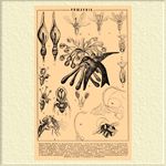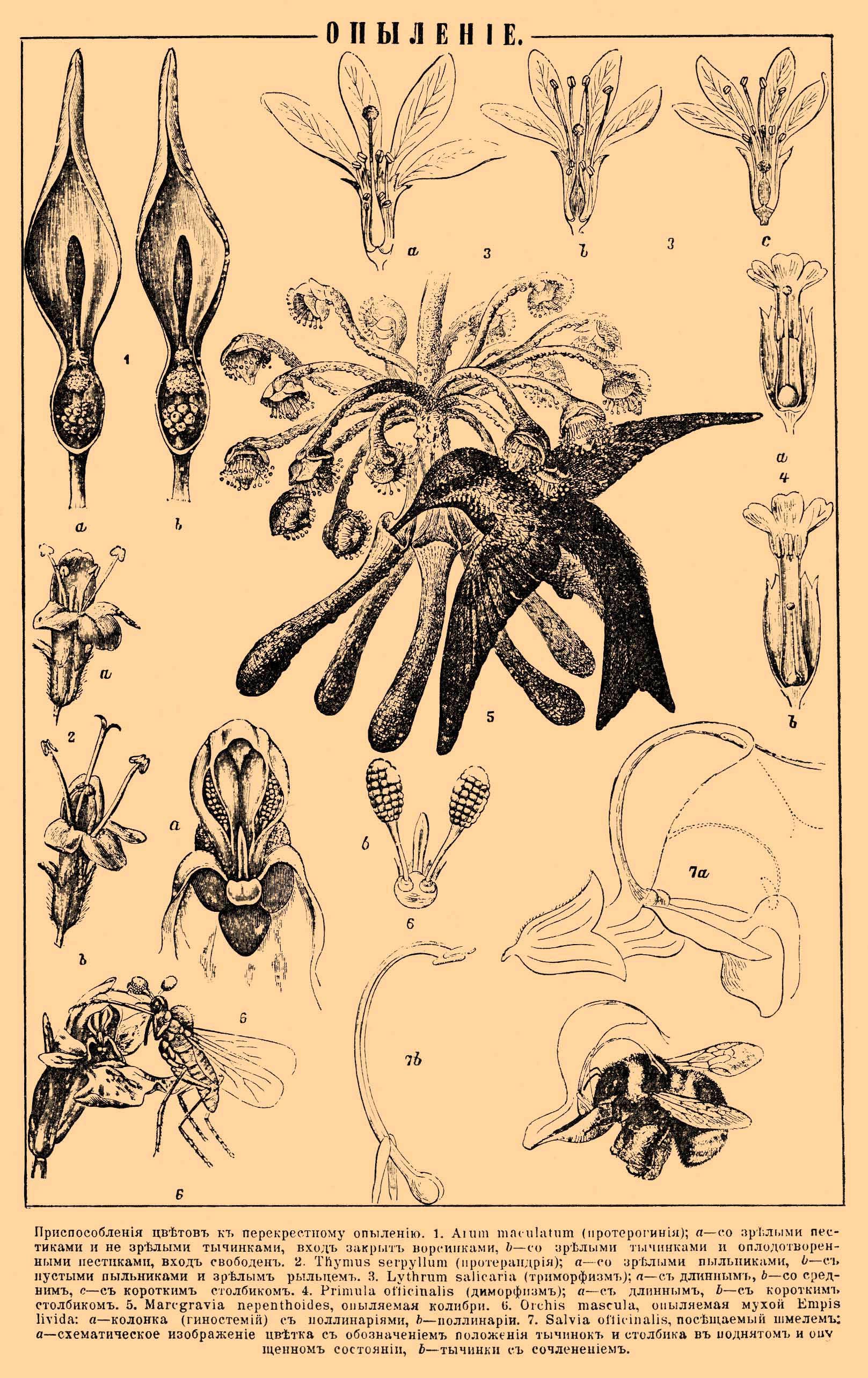 ОПЫЛЕНИЕ. Приспособления цветов к перекрестному опылению. 1. Arum maculatum (протерогиния); а — со зрелыми пестиками и незрелыми тычинками, вход закрыт ворсинками, b — со зрелыми тычинками и оплодотворенными пестиками, вход свободен. 2. Thymus serpyllum (протерандрия); а — со зрелыми пыльниками, b — с пустыми пыльниками и зрелым рыльцем. 3. Lythrum salicaria (триморфизм); а — с длинными, b — со средним, с — с коротким столбиком. 4. Primula ofticinalis (диморфизм); а — с длинным, b — c коротким столбиком. 5. Marcgravia nepenthoides, опыляемая колибри. 6. Orchis mascula, опыляемая мухой Empis livida: a — колонка (гиностемий) с поллинариями, b — поллинарии. 7. Salvia ofticinalis, посещаемый шмелем: а — схематическое изображение цветка с обозначением положения тычинок и столбика в поднятом и опущенном состоянии, b — тычинки с сочленением.