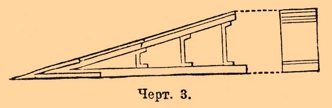 Скорость О., общую для орудия и лафета, получим, приложив к движению системы (снаряд, орудие и лафет) закон сохранения движения центра тяжести. Сила (С), производящая О. — внутренняя по отношению к системе, потому приобретенное количество движения системы = 0, т. е.: mV — (Mo + M л )W = 0. (1), также mk — (Mo + M л )n = 0. (2), где m, Mo, M л соответственно массы снаряда, орудия и лафета (массой заряда пренебрегаем); V и W — начальные скорости снаряда и О., k и n — пути, проходимые снарядом по каналу, а орудием с лафетом по местности в то же время. Из (1) следует: W = mV/(Mo + M л ) — скорость О., отсюда живая сила лафета Ж = Мл W2/2 = (Мл /2) m2V2/(Mo + M л )2, последняя должна равняться произведению cилы С на путь п, Сп = (Мл /2) m2V2/(Mo + M л )2, и C = (l/n)(Мл /2) m2V2/(Mo + M л )2 = m2V2/2. 1/(1 + Мо / Мл) · 1/k (подставив из (2) n = mk/( Мо + Мл)). Таким образом, действие силы, производящей О., уменьшается с уменьшением живой силы снаряда (его веса и скорости), с увеличением массы или веса орудия и с уменьшением веса лафета. О. в большинстве случаев стараются уменьшить, если не совершенно устранить, потому что он замедляет стрельбу, утомляет орудийную прислугу, в полевой артиллерии в особенности, требует лишнего места; с другой стороны, в смысле сохранения прочности лафета, желателен больший О., потому что живая сила отдачи частью тратится на О., частью поглощается самим лафетом, производя в последнем различные деформации; чем короче О., тем больше деформируется, страдает лафет. В легких и батарейных лафетах О. ограничивается стальным сошником (оковка хобота), врывающимся в землю при движении лафета. В последнее время испытывается полевой лафет с самонакатыванием — длина отката не превосходит нескольких дюймов. В горных лафетах, кроме сошника для уменьшения отката, употребляют канатный тормоз, закладываемый серединой за крючья станин, а петлями на концах надеваемый на крючья у ступиц колеса; при О. тормоз наматывается на ступицы, затормаживает колеса и прекращает O. В крепостной и осадной артиллерии почти во всех случаях О. нежелателен и допущен настолько, чтобы лафет не испытывал слишком большого разрушительного действия. Для уменьшения О. увеличивают сопротивления, встречаемые лафетом при движении, что достигается различными средствами: 1) посыпают платформы песком, следов. увеличивают трение между лафетом и платформой, 2) устанавливают за колесами лафета откатные клинья (деревянные или железные, черт. 3; вид сбоку и сзади), на которые взбегают при О. колеса, хобот же скользит по платформе.