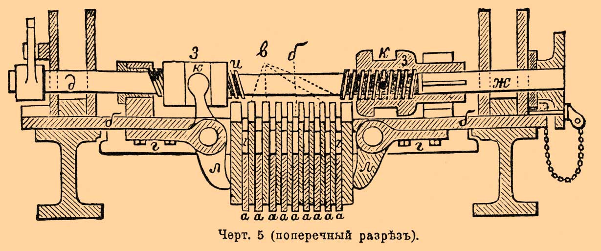 При О. лафет (особыми кулаками) сперва поворачивает рукоятку и таким образом через посредство зажимного винта нажимает дубовые подушки к раме, затем ударяет в железные дуги (в) и, увлекая их за собой, возбуждает сильное трение между подушками компрессора и станинами рамы; на преодоление этого трения расходуется живая сила лафета — О. ограничивается. 11-дм. лафеты прежней конструкции имеют гребенчатый или струнный компрессор (черт. 5); вдоль рамы посредине расположены ребром железные полосы — струны (а); концы их закреплены в передней и задней стене рамы.