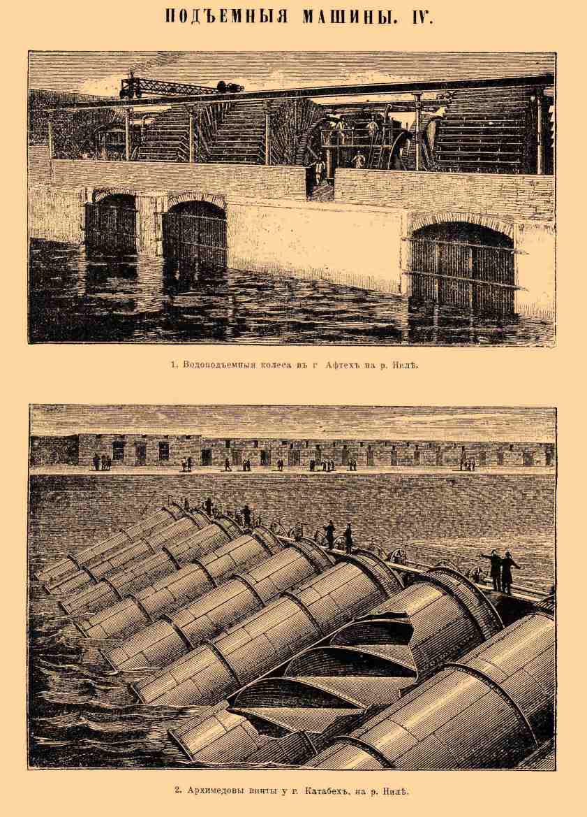 1. Водоподъемные колеса в г. Афтех на Ниле. 2. Архимедовы винты у г. Катабех на Ниле.