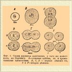 — процесс, имеющий место при созревании мужских и женских половых элементов и сводящийся к тому, что количество находящихся в ядре половой клетки элементов красящегося вещества (хроматина или нуклеина) уменьшается вдвое. Уже давно было замечено, что при созревании яйца на его поверхности появляются два небольших тельца, из коих одно обыкновенно делится пополам. Их назвали руководящими пузырьками (Richtungsbl ä schen), полярными тельцами и, наконец, теперь называют редукционными пузырьками. Когда процесс этот был изучен точнее (О. Гертвигом преимущественно), то оказалось, что мы имеем дело с делением яйца на 4 части, но только разделяющиеся части, хотя и являются настоящими клетками — оказываются весьма неровной величины. Одна из этих частей сравнительно с прочими громадна, содержит в себе часто массу питательного материала — это яйцо. Три прочие части малы и представляются как бы недоразвитыми и предназначенными к уничтожению яйцами. Это, следов., абортивные яйца, содержащие слишком мало питательного материала, чтобы развиваться далее. Они-то и представляют собой — редукционные пузырьки. Подобно настоящему яйцу, они содержат ядро с определенным для каждого животного числом хроматинных элементов. Если неоплодотворенное яйцо (половая клетка) имело 4 элемента (фиг. 1а), то перед выделением первого редукционного пузырька число их увеличивается вдвое, почему первый пузырек и яйцо, получающие каждый половину всего числа, содержат по 4 элемента (B, С и D).