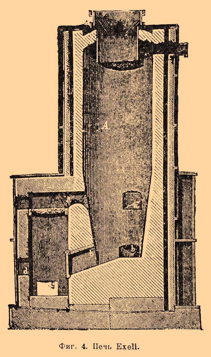 Каждый канал устроен из нескольких десятков грушеобразных глиняных сосудов (Aludel), герметически соединенных между собой; они лежат в желобах, устроенных на особой постройке. Последняя представляет две поверхности, пересекающиеся под известным углом (сначала идет, опускаясь к земле, а затем поднимается). Глиняные сосуды в восходящей ветви канала имеют в расширенной части небольшие отверстия, через которые выливается конденсирующаяся Р.; она стекает вниз, попадает в желоб b и отсюда стекает в приемники. Пройдя через глиняные сосуды, газы поступают в конденсационную камеру; здесь они встречают перегородку, не доходящую до дна камеры, которая заставляет их спуститься вниз; там они проходят над поверхностью воды, поднимаются вверх и выходят через вытяжную трубу наружу. Когда печь пускается в ход, то на решетку кладут сначала некоторой толщины слой бедной руды, затем идет обыкновенная руда, затем наиболее богатая, Stupp, брикеты из рудной мелочи, обломки глиняных сосудов (Aludel) и пр., всего до 11,5 тонн. Топка производится около 10 часов; когда начинается дистилляция Р., топка прекращается и температура поддерживается сгоранием серы. Когда процесс кончится, ждут около суток, чтобы печь остыла и затем разгружают ее. Вся операция длится около 3 суток. Печи эти вредны для здоровья; глиняные сосуды легко бьются; потеря Р. значительна. В Идрии действовали печи Леопольди, похожие на вышеописанные; разница заключалась в том, что в них устраивали 3 решетки, которые разбивали печь на 3 отделения для различной величины кусков руды; вместо ломких глиняных сосудов строили кирпичные камеры, разделенные перегородками, не доходящими попеременно до пола и до потолка, так что газы должны были проходить через них, постоянно меняя направление. Наибольший интерес представляют непрерывно действующие печи, появившиеся в середине этого столетия; здесь не нужно останавливать печь для загрузки и выгрузки руды: свежая руда постоянно поступает в печь сверху, а обожженная постоянно удаляется снизу. Вся задача заключается в том, чтобы руда, спускаясь сверху вниз, известное время пробыла в печи, достаточное для полного удаления Р.; кроме того, нужно, чтобы она достаточно охладилась в печи, прежде чем ее будут окончательно выгребать (тогда из нее будет меньше выделяться ртутных паров). Систем непрерывно действующих печей множество. В Идрии и в Новом Альмадене в большом ходу печи Exeli (фиг. 4).