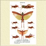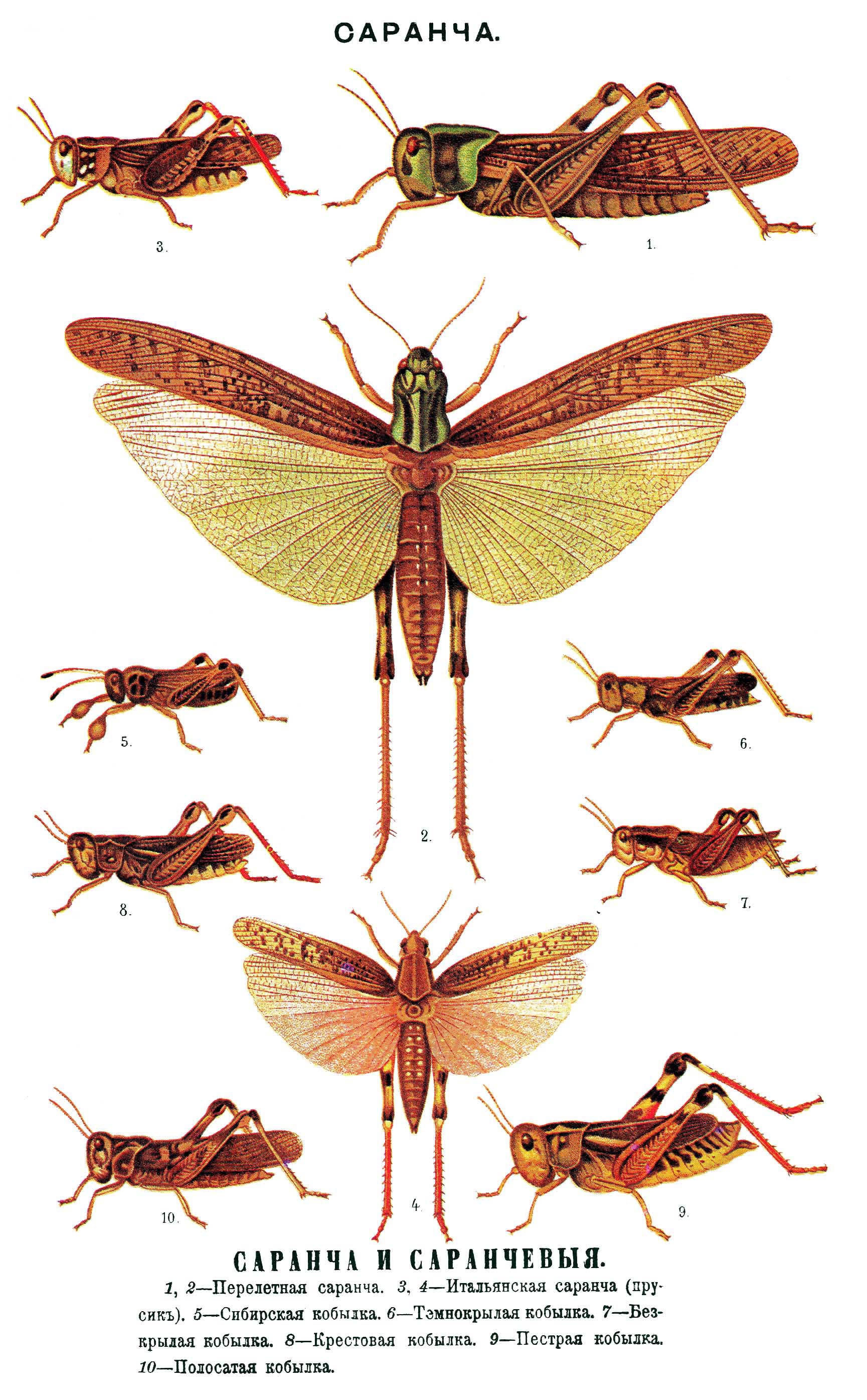 САРАНЧА. 1. Перелетная саранча. 2. Перелетная саранча. 3. Итальянская саранча (прусик). 4. Итальянская саранча (прусик). 5. Сибирская кобылка. 6. Темнокрылая кобылка. 7. Бескрылая кобылка. 8. Крестовая кобылка. 9. Пестрая кобылка. 10. Полосатая кобылка.