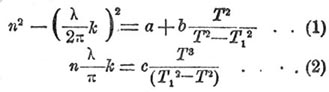 Из (2) уравнения, при Т 1 = Т, получается k = ∞, а это указывает, что при синхронизме колебаний частиц исследуемого вещеcтва и частиц эфира, призма должна задерживать все лучи периода Т и, след., должна дать в спектре одну абсорбционную полосу, по сторонам которой k — симметрично убывает. При таком условии yp. (1) показывает, что n — при переходе от лучей (инфракрасных) с периодом, большим Т, к лучам с периодами, близкими к Т, непрерывно увеличивается; достигнув maximum'a при Т = Т 1, n затем быстро уменьшается до некоторого minimum'a и снова непрерывно растет для лучей, приближающихся к ультрафиолетовым.