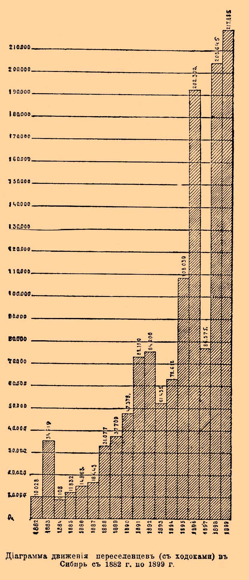 Диаграмма движения переселенцев (с ходоками) в Сибирь с 1882 г. по 1899 г.