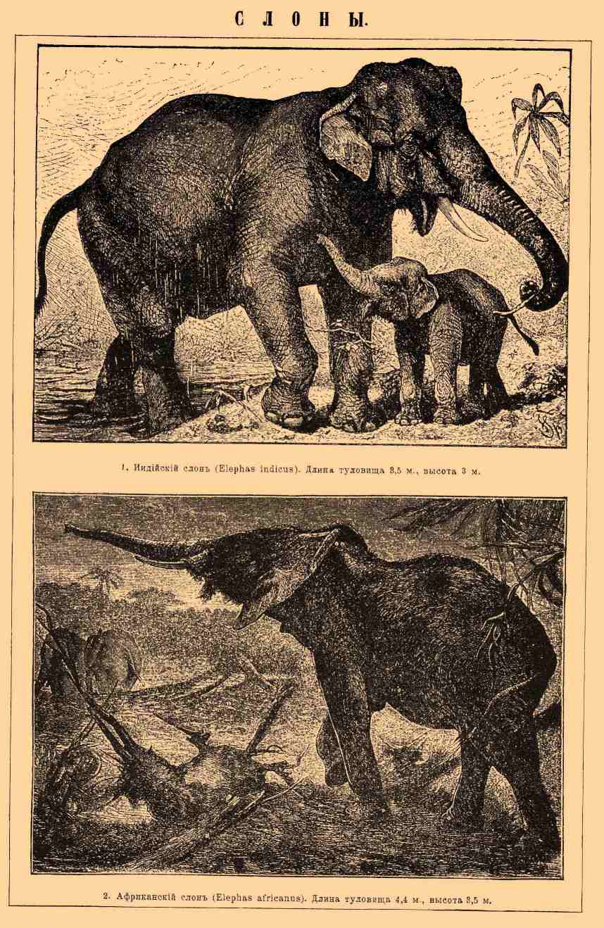 Слон (Elephas) — единственный современный род отряда хоботных (Proboscidea) млекопитающих с двумя видами E. indicus (азиатский С.) и E. africanus (африканский С.). Анатомические признаки — cм. выше. Aзиamский С. Длина тела от конца хобота до конца хвоста 7 м, из которых 2 приходятся на хобот и 1,5 на хвост; высота у загривка до 3 м. Вес крупных экземпляров до 4000 кг. Сложен массивнее африканского. Ноги толсты и сравнительно коротки. Широкий лоб, вдавленный посередине и сильно выпуклый с боков, имеет почти отвесное положение; его бугры представляют высшую точку тела. Уши средних размеров, неправильной четырехугольной формы, с несколько вытянутым кончиком и завороченным внутрь верхним краем. Бивни значительно меньше, чем у африканского С., длиною до 1,6 м, весом до 20 кг. Они развиваются только у самцов, редко у самок. Копыт на передних ногах 5, на задних 4. Водится к югу от Гималайского хребта и на островах Цейлоне, Суматре, Борнео. С. Суматры несколько отличаются от материковых и, может быть, представляют особую разновидность. В Индии различают 3 породы или, вернее, 3 сорта особей, так как они встречаются все вместе в одном стаде и находятся друг с другом в кровном родстве. Наиболее ценится "Кумириа", который отличается массивным телосложением и толстой кожей, широкой грудью, сильным хоботом, плоской, понижающейся назад спиной и короткими ногами. Наименее —" Миерга", легче сложенный, с узкой грудью, маленькой головой и слабым хоботом, выпуклой спиной и длинными ногами. Особи "Двазала" занимают середину по своим наружным признакам и своим качествам и составляют во всех стадах громадное большинство (до 90%). Рассказы о белых слонах представляют вымысел. Альбиносы составляют среди С. большую редкость и служат в Сиаме до известной степени предметом культа. Обыкновенно они только немного светлее и имеют несколько еще более светлых пятен. Лучшие экземпляры их были бледного красновато-бурого цвета с бледно-желтой радужной оболочкой и редкими белыми волосами на спине. Африканский С. гораздо крупнее азиатского и достигает до 5 метров высоты. Тело его относительно короче и покоится на более длинных ногах, грудь узкая. Лоб сужен кверху и скошен назад благодаря менее сильному развитию воздушных полостей в лобных костях. Спина выпуклая. Кожа голубовато-аспидного цвета и образует более крупные складки. Громадные плоские уши неправильно пятиугольной, почти полулунной формы прикрывают шею и плечи и почти касаются друг друга как на затылке, так и под горлом. Бивни гораздо крупнее, чем у азиатского С., и большею частью развиваются и у самок, но у них они несколько меньших размеров, чем у самцов. Вполне развитые бивни имеют обыкновенно от 2 до 2,5 м длины при 30—50 кг веса. Самые длинные из доставленных в Европу бивней имели до 3 м длины при сравнительно незначительном весе (44 кг) благодаря их тонкости; самые тяжелые — весили до 144,5 кг при 2,27 м длины. Копыт на передних ногах 4, на задних 3. Водится в тропической Африке к югу от Сахары от озера Чад до озера Нгами. С. населяют большие леса и держатся преимущественно по близости воды. Они любят тепло и влагу, но не боятся и холода. Питаются исключительно растительной пищей; они не только объедают на деревьях листья и почки, но даже молодые ветви и кору. Живут стадами обыкновенно в несколько десятков голов, а по рассказам путешественников — и до 1000. Вожаком
