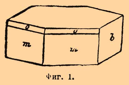 C = [001]; M = [110]; b = [010] и m = [111]. Угол MМ = 59°49' (почти 60%, чем и объясняется сходство с крист. гексагональной системы). Нередки двойники, причем неделимые срастаются друг с другом своими боками (по некоторой плоскости, лежащей в зоне [001]: [110] и перпендикулярной к [001]) или накладываются одно на другое плоскостями [001]; такие двойники представлены на фиг. 3 и 4.