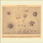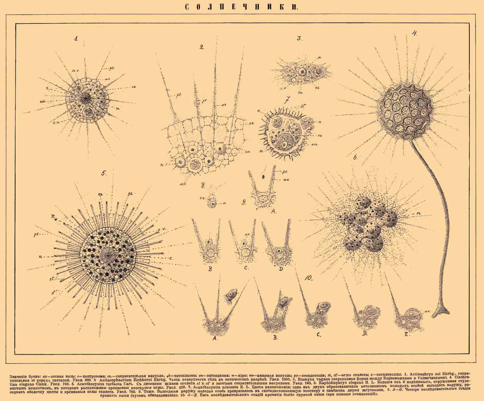 Значение букв: ах — осевая нить; с — центрозома; сv — сократительная вакуоль; ek — эктоплазма; en — энтоплазма; n — ядро; nv — пищевая вакуоль; ps — псевдоподии; st, st' — иглы скелета; s — зоохлореллы. 1. Actinophrys sol Ehrbg., сократительная cv перед систолой. Увел. 600. 2. Actinosphaerium Eichhorni Ehrbg. Часть поверхности тела в оптическом разрезе. Увел. 1000. 3. Biomixa vagans (переходная форма между корненожками и солнечниками). 4. Clathrulina elegans Cienk. Увел. 750. 5. Acanthocystis turfacea Cart. С двоякими иглами скелета st и st' и многими сократительными вакуолями. Увел. 240. 6. Raphidiophrys elegans H. L. Колония из 8 неделимых, окруженная студенистым веществом, в котором расположены кремневые изогнутые иглы. Увел. 430. 7. Acanthocystis aculeata H. L. Циста размножения; одна из двух образовавшихся почкованием молодых особей выходит наружу, разорвав оболочку цисты и кремневые иглы скелета. Увел. 760. 8. То же. Вышедшая наружу молодая особь превратилась в свободноплавающую зооспору и снабжена двумя жгутиками. 9. А — О. Четыре последовательные стадии принятия пищи (путем обволакивания). 10. А — Е. Пять последовательных стадий принятия более крупной пищи (при помощи псевдоподий).