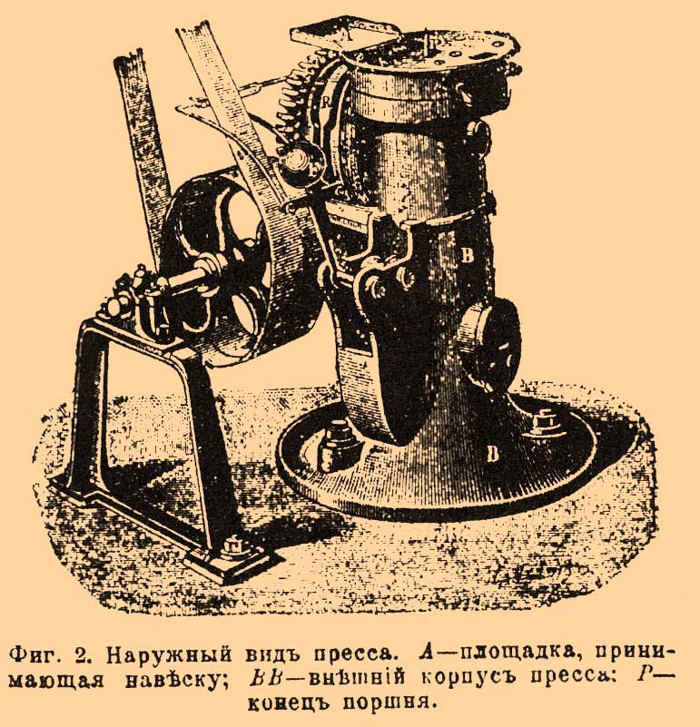 Фиг. 2. Наружный вид пресса. А — площадка, принимающая навеску; BB — внешний корпус пресса; P — конец поршня.
