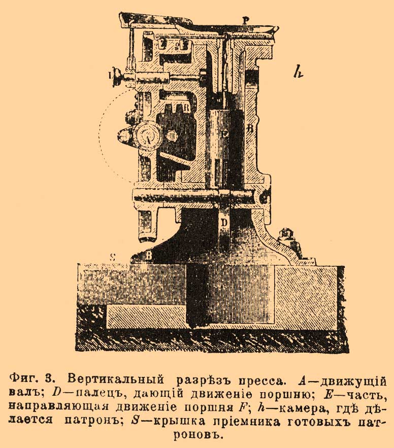 Фиг. 3. Вертикальный разрез пресса. А — движущий вал; D — палец, дающий движение поршню; Е — часть, направляющая движение поршня F; h — камера, где делается патрон; s — крышка приемника готовых патронов.