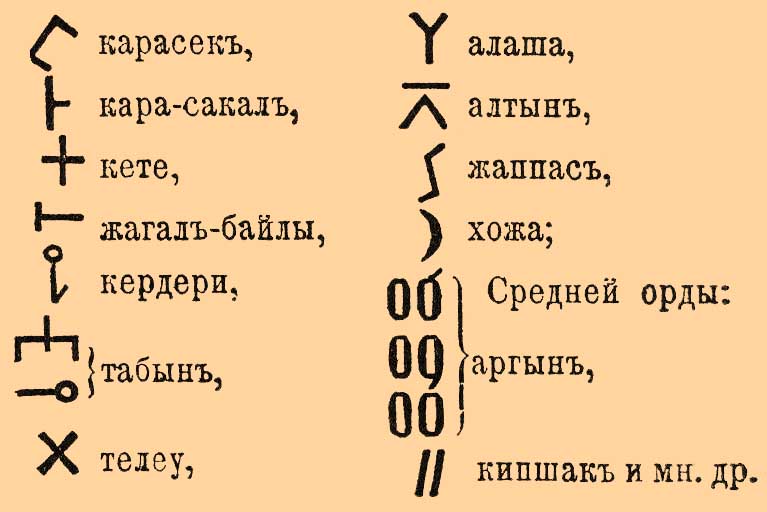 Каждое Т. носит название по сходству с изображаемым предметом или, вернее, с предметом, который оно должно изображать: например Т. рода жагал-байлы называется молотком (балга). На Кавказе Т. более замысловаты по изображению, так как большинство крупных коневладельцев принадлежит к султанским и княжеским родам, гербы которых отличаются вычурностью.