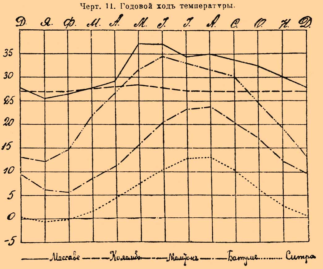 Отсюда видно, что в теплые месяцы года среди дня близ поверхности земли в Пулкове было гораздо теплее, чем на высоте 26 м, и разность была больше в ясные дни, вечером же обратно: нижний слой был холоднее и разность очень значительно увеличивалась при ясной погоде; особенно велика разность в августе и сентябре, когда это время приходится после захода солнца. В Алипуре близ Калькутты, т. е. уже в тропиках, в январе (ясное, сухое время года) получается очень низкая Т. в нижнем слое воздуха по сравнению с вышележащим рано утром и вечером; а в августе, т. е. в пасмурное дождливое время года — разницы почти нет. Наблюдения в Упсале в Швеции дали следующие результаты: