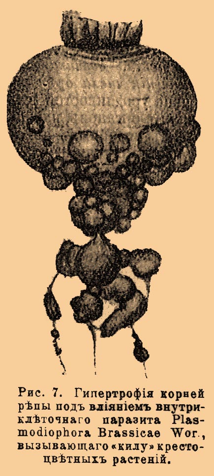 Рис. 7. Гипертрофия корней репы под влиянием внутриклеточного паразита Plasmodiophora Brassicae Wor., вызывающего "килу" крестоцветных растений.
