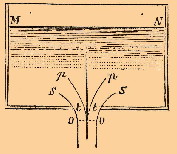 Строение истекающей струи. Савар показал (Savart, "Annales de chim. et de phys.", т. III), что струя, вытекающая из отверстия в дне сосуда, после сжатия не падает сплошным цилиндром, но представляет быстро следующие одни за другими утолщения и сжатия, а на некотором расстоянии от отверстия вниз разделяется на капли сфероидальные, большей или меньшей величины, и эллипсоидальные, растянутые то по направлению струи, то перпендикулярно ему. Впоследствии Магнус повторил и разнообразил эти опыты, изменяя и форму отверстия, через которое вытекала струя (щелеобразное, две пересекающиеся щели, квадратное). Эти капли не могут быть видны раздельно просто глазом, так как очень быстро следуют одна за другой. Чтобы видеть их, Савар и Магнус употребляли один и тот же, в сущности, прием. В опытах Магнуса служил вертикальный быстро вращающийся (стробоскопический) кружок, в котором были вырезаны щели по направлению радиусов. При достаточной быстроте вращения кружка каждая щель перемещалась на свою ширину в 1/15000 (и менее) секунды, поэтому, глядя чрез щель, приходившую в вертикальное положение, можно было получать оптическое впечатление, длившееся сказанный малый промежуток, в который части струи казались неподвижными. Этот разрыв струи на капли можно объяснить неустойчивостью формы длинного жидкого цилиндра, который стремится разделиться на сфероидальные капли (см. Тела жидк.). Струя, направленная согнутой трубкой вверх, вытекая из сосуда, бьет фонтаном, форма которого может быть изменена посредством твердых тел (пластинок, трубок), помещенных на пути струи (см. Фонтаны).