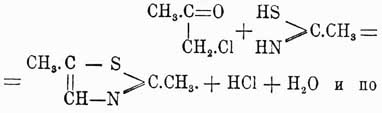 Запах Т. также напоминает запах пиридиновых оснований. Главное различие в свойствах тиомоноазолов и пиридинов заключается в том, что, как известно, пиридины (см.) до крайности трудно обменивают свои водородные атомы ядра на отрицательные радикалы, в тиомоноазолах такой обмен совершается довольно легко, хотя и не прямым путем, который опять-таки вовсе неприменим к пиридинам. Дело в том, что, конденсируя галоидопроизводные кетонов не с тиоимидами кислот, а с тиомочевиной, можно получить μ-амидометилтиазол