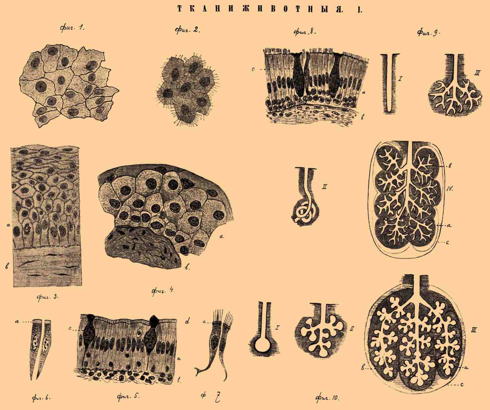 Фиг. 1. Плоский однорядный эпителий. Сердечная сумка кошки. Увелич. в 200 раз. Фиг. 2. Плоский однорядный эпителий, покрывающий заднюю поверхность роговой оболочки глаза собаки. Видны нити и межнитчатое вещество протоплазмы клеток, межклеточное вещество и протоплазматические мостики. Увелич. в 500 раз. Фиг. 3. Часть разреза роговой оболочки глаза человека. a — эпителий; b — подлежащая соединительная ткань. Увелич. в 500 раз. Фиг. 4. Часть разреза мочевого пузыря мыши. а — многорядный плоский эпителий; b — подлежащая соединительная ткань. Увелич. в 500 раз. Фиг. 5. Часть разреза тонкой кишки кошки. a — однорядный призматический (цилиндрический) эпителий; b — подлежащая соединительная ткань; с — бокаловидные слизистые клетки; d — кутикулярный ободок. Увелич. в 500 раз. Фиг. 6. Две изолированные клетки однорядного призм. эпителия из тонкой кишки кошки, а — кутикулярный ободок. Увел. в 500 раз. Фиг. 7. Две изолированные клетки из многорядного мерцательного эпителия дыхательного горла собаки, a — утолщенные (базальные) концы мерцательных волосков. Увелич. в 500 раз. Фиг. 8. Часть разреза дыхательного горла кошки. а — многорядный призматический мерцательный эпителий; b — подлежащая соединительная ткань. Увелич. в 500 раз. Фиг. 9. Трубчатые железы. I — простая трубчатая железа; II — простая трубч. железа, конец которой изогнут наподобие клубочка; III — простая ветвящаяся трубчатая железа; IV — сложная ветвящаяся трубчатая железа. a — доли; b — дольки; с — соединительнотканная оболочка. Схематические рисунки. Фиг. 10. Альвеолярные (пузырчатые) железы. I — простая альвеолярная железа; II — ветвящаяся альвеолярная железа; III — сложная ветвящаяся альвеолярная железа, a — доли; b — дольки; с — соединительнотканная оболочка. Схематические рисунки.