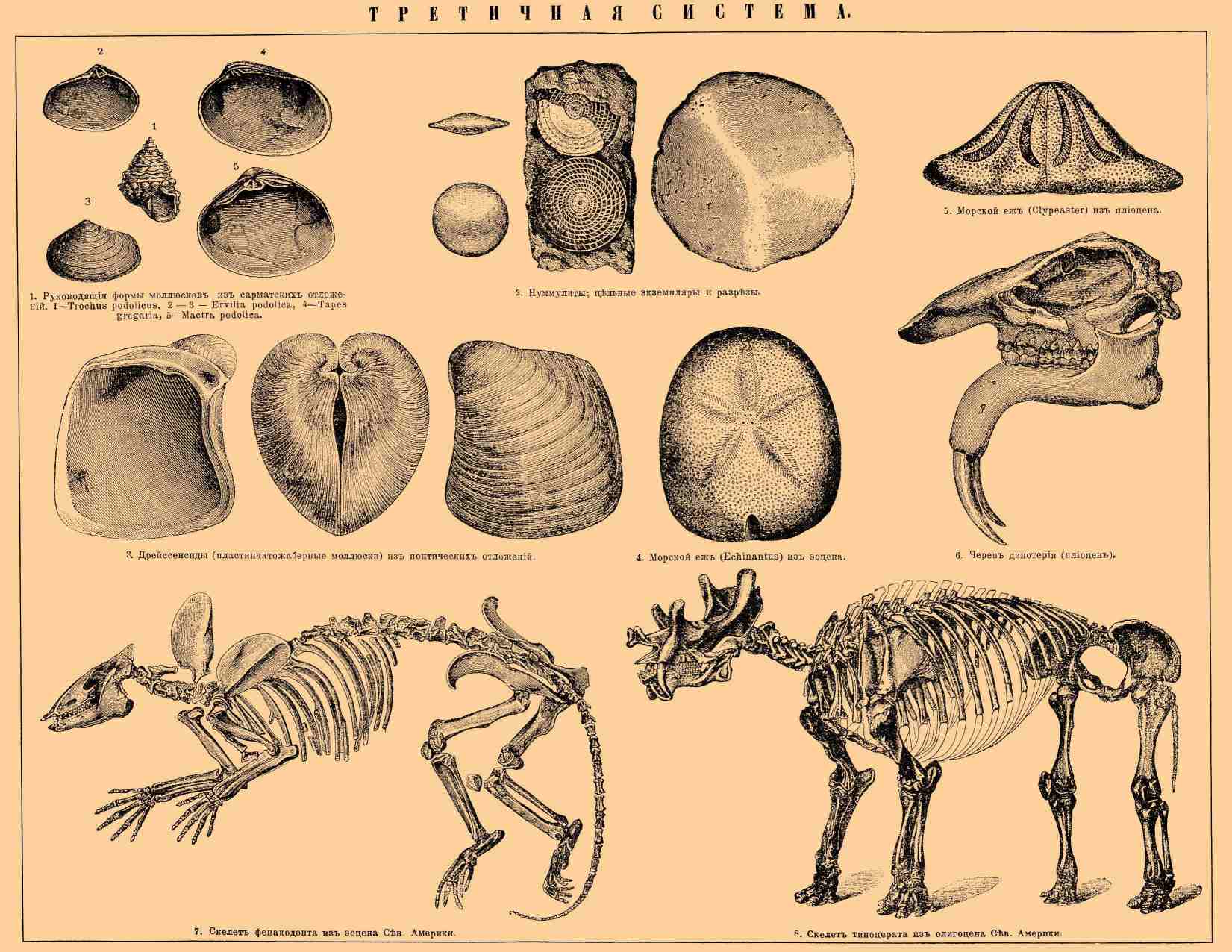Органический мир ее характеризуется исчезновением многих выдающихся мезозойских типов. Флора отличается развитием цветковых растений. Среди беспозвоночных исчезают столь характерные для мезозоя аммониты, белемниты, неринеи, рудисты и друг. Некоторые группы делаются редкими (фоладомии и др.). В нижнетретичных образованиях большого развития достигают нуммулиты, образующие громадные пласты известняка, среди иглокожих важную роль начинают играть клипеастриды и спатангиды, среди моллюсков двустворчатые с сифонами и гастероподы с сифональным устьем. Вымерших родов встречается мало (следует, впрочем, отметить, что как раз в новейших Т. образованиях пресноводных востока Европы, в том числе и России, имеются некоторые интересные вымершие формы моллюсков — Valenciennesia, Pr o sodacna etc. Среди позвоночных надо отметить исчезновение многих отрядов мезозойских рептилий, как-то морских рептилий (ихтиозавров, плезиозавров, мозазавров), летающих рептилий (птерозаврий) и колоссов мира пресмыкающихся — динозавров, между птицами надо отметить нахождение громадных вымерших форм (Dinornis, Gastornis Phorarhacos). Особо важное значение для Т. отложений представляют млекопитающие. В мезозое имеются лишь несомненные сумчатые и близкие к ним формы (Allotheria). В Т. пластах появляются и представляют пышное развитие плацентные млекопитающие, их тут много видов и целый ряд вымерших форм. Имеется несколько вымерших отрядов и подотрядов (отряд Creodontha, примитивная группа хищных, промежуточная между сумчатыми и современными хищными), отряд Til l odontia, подотряд Gravigrada и Loricata среди неполнозубых, а среди копытных подотряды Typotheria, Toxodontia, Litopterna, Amhlypoda, Ancylopod Соndylarthra). Подотряд Condylarthra служил исходной точкой для многочисленных форм парно- и непарнокопытных (P e risso- и Аrtiodaciyte) и послужил материалом для палеонтологических работ В. Ковалевского, Копа, Марша, Осборна, Рютимейера, М. Павловой, которые дали одно из самых блестящих подтверждений эволюционной теории. Между копытными формами некоторые характерны для известных отделений Т. отложений (как, напр., Typotheria, Toxodontia, Litopterna для Т. отложений Южной Америки, Coryphodon, Paleotherium, Hipparion, Anttiracotherium, Anoplotherium etc. для различных горизонтов Европы и Сев. Америки), другие же своими крупными размерами (Uintatherium, Tinoceras, Titanotherium, Dmoiherium, Mastodon, Sivatherium etc.). T. образования занимают большие поверхности в Европе (Англии, Франции, сев. Германии, на Ю России и в средиземноморских странах), затем в Малой Азии, Гималаях, Индокитае, Зондских о-вах, а также в северной Африке. Другой областью развития Т. отложений будет Северная Америка, где, кроме морских осадков по Атлантическому побережью, имеются громадные континентальные отложения с остатками млекопитающих и, наконец, Патагония и Аргентина. Сравнение между собою Т. отложений не только Старого и Нового Света, но и напр. различных стран Европы представляет громадные затруднения, почему и до сих пор трудно дать общее разделение Т. системы на отделы. Т. (главным образом) морские отложения Европы и Старого Света, вообще, можно подразделить следующим образом:
